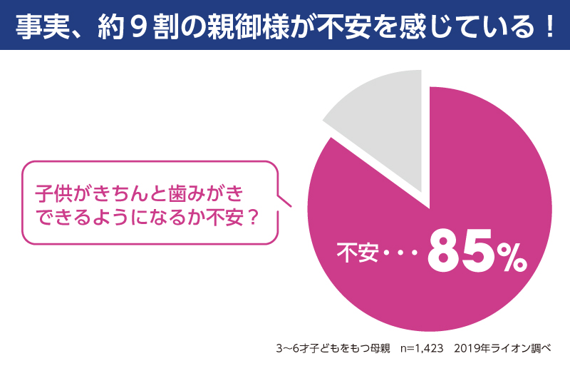 「子供がきちんと歯みがきできるようになるのか?」という不安を抱えているファミリーは85%にものぼることがLIONの調べでわかった。この不安をさらに詳細に分析すると、子供の歯みがきに対する親の2大悩みが浮かび上がった。