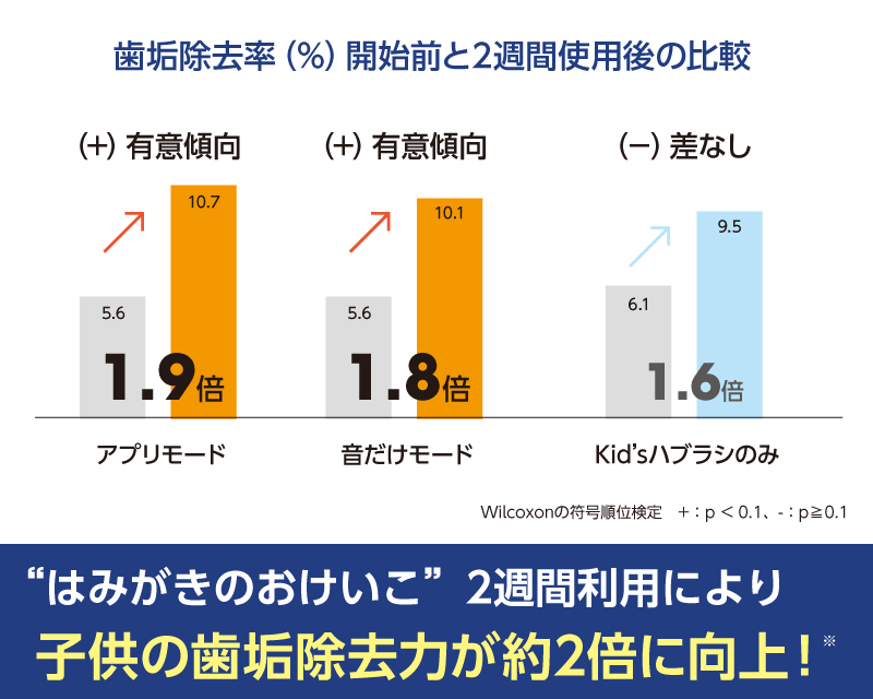 ※本製品を用いて2週間歯みがきを実施した群(アプリモード利用群、音だけモード利用群)の歯垢除去率が、試験開始前と比べて1.9倍に上昇、開始前後で有意な傾向が認められた。歯みがき手順書に従い、ハブラシのみで歯みがきを2週間実施した対照群は、開始前後の差は認められなかった。出典:佐竹ら, 小児歯科学雑誌, 58巻, 2020, 259