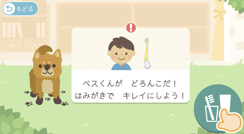 オリジナルキャラクターの動物は、5種類から好きなキャラを選べる。アプリの中で、「泥んこで汚れてしまった動物のキャラクターを歯みがきできれいにする」というストーリーが展開される絵本型コンテンツ。子供が歯の清潔という概念を理解しやすく、キャラクターのために歯みがきを上達したいと自ら向上心を持つ設計。