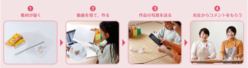 毎月1日に、アートに関する教材動画をオンデマンド配信。動画公開に合わせて前月の月末までに到着するよう郵送される教材キットを使って、動画を見ながら、季節感を感じられるさまざまなテーマの制作活動を行うというもの。素材そのものを扱うため、素材の触感や匂いなど五感でアートを楽しめる。