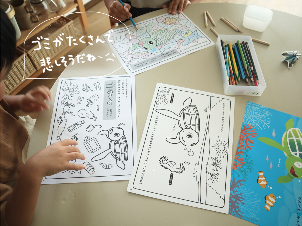 ワークシートは小学生向けの内容だが、セットの中には小さい子でも気軽に楽しめる「ウミガメのちゅらくん」のぬりえもついている。兄/姉はワークブック、弟/妹はぬりえ、という感じで家族で取り組むのも楽しい。ぬりえの内容も環境問題がテーマなので、楽しみながらSDGsに触れることができる。