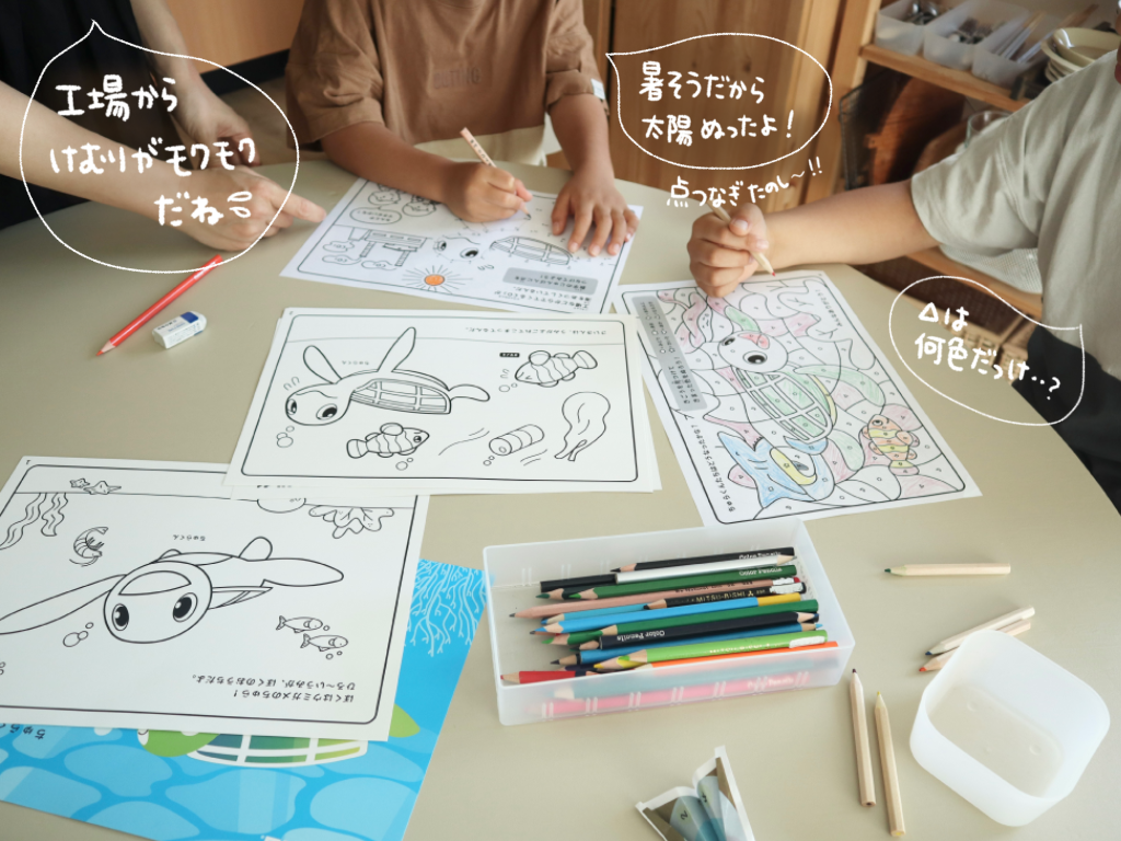 園児の次男は、以前絵本で海の環境問題に触れたものを読んだこともあり、ちゅらくんの話に絡めた内容は頭に入りやすかったようです。ぬりえ、点つなぎが特に気に入ったようで、もっとやりたいと言っていました!