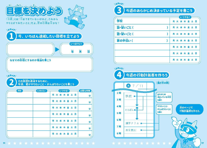 ラインナップは「時間と約束を守ることができる!」「目標達成が楽しくなる!」「気持ちが元気になる!」の3冊。さっそく小4の上の子に「こんなのがあるよ、やってみない?」と誘ってみると……