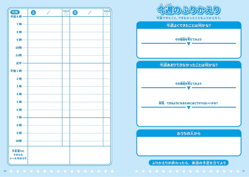 最初から全部できないのは当たり前。毎週「ふりかえり」をして、「今週できたこと」「今週あまりできなかったこと」「来週できるようにはどうすればいいか」を考えるように設計されている。
