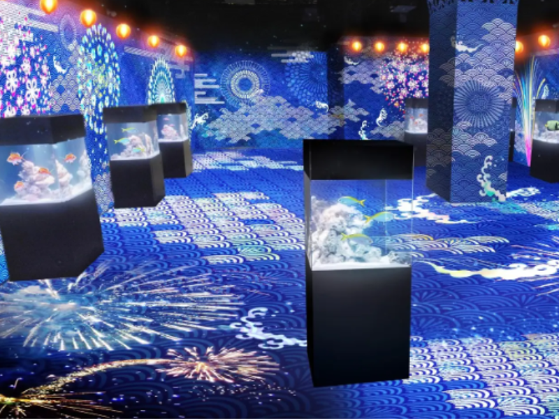 昼夜で異なるドルフィンパフォーマンスから、デジタル花火に彩られ、まるで縁日空間のような水槽展示エリア、屋台風にアレンジされたメニューなど、子どもたちが飽きることのない空間となっている。