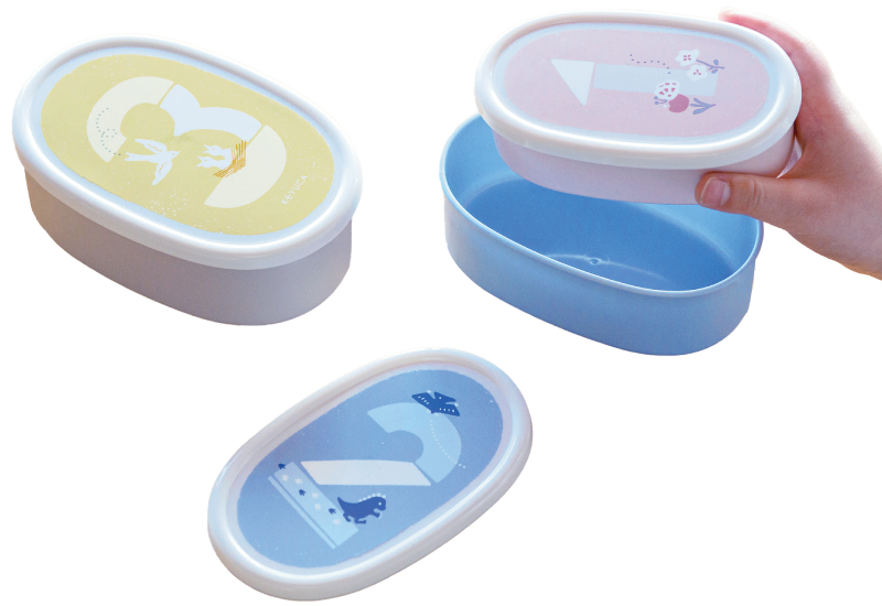 コンパクトに片付けられる入れ子式の容器。ミニお弁当箱や、小さなおもちゃ入れにも◎! 数字に合わせたデザインにも注目。容器の大きさと数字の大きさが対応しているので、自然に数に親しむことができる。抗菌加工付き、電子レンジ・食洗機使用可。