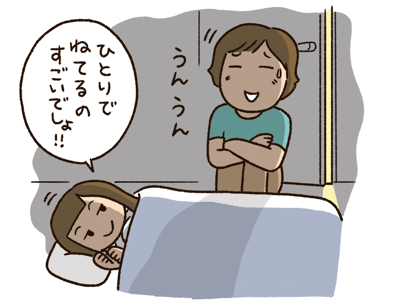 なんでも1人で! 自分で! やりたい年頃の2歳の娘。寝るのももちろん“1人で”がいいのですが、暗くて静かな部屋に1人は怖いようで、ベッドに座って見守ることを強要されます。横に寝転ぶのは1人で寝ていることにならないようで、イヤイヤ発動……! 娘が寝付くまで30分ほど、ただただ暗闇で体育座りをさせられる毎日です。