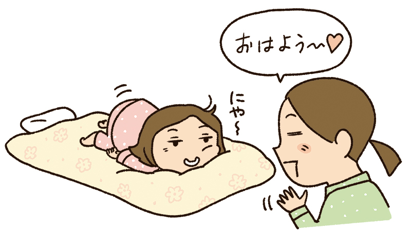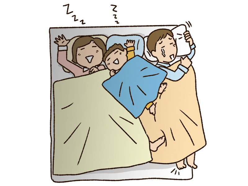 寝かしつけたときにはまっすぐ寝ているのに、一度離れてから、いざ寝ようと布団に戻ると、向きが変わっていてパパの寝るスペースが激狭に!! 変なかっこうで寝るはめになるので、朝起きると肩こり・腰痛がひどい!!(笑)