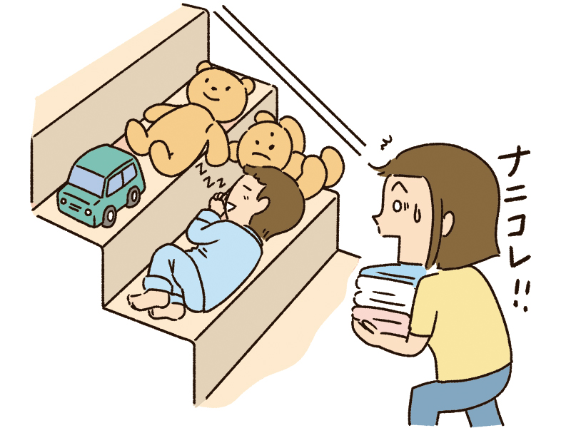 階段のステップにちょうど頭から足までハマったまま寝ました。