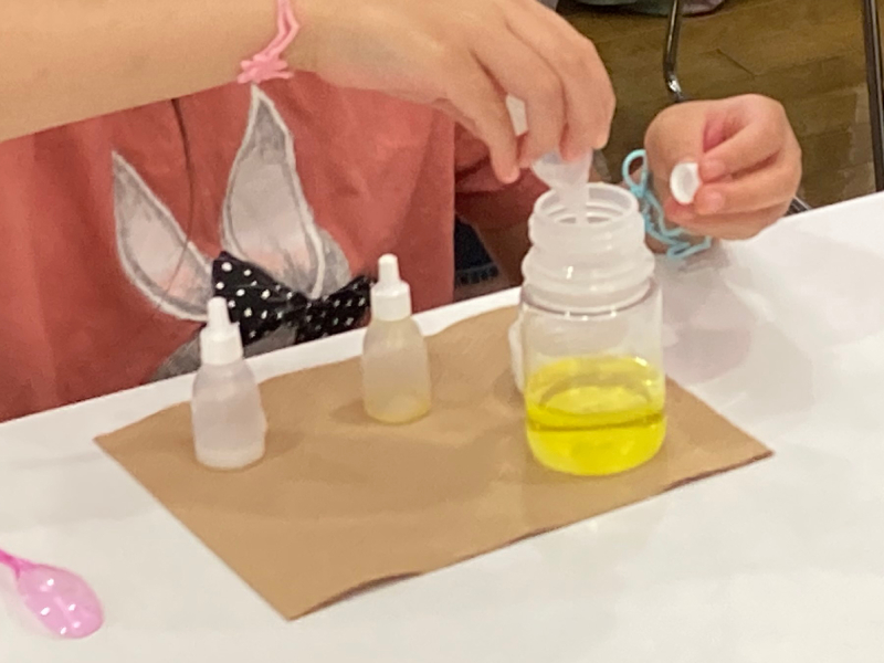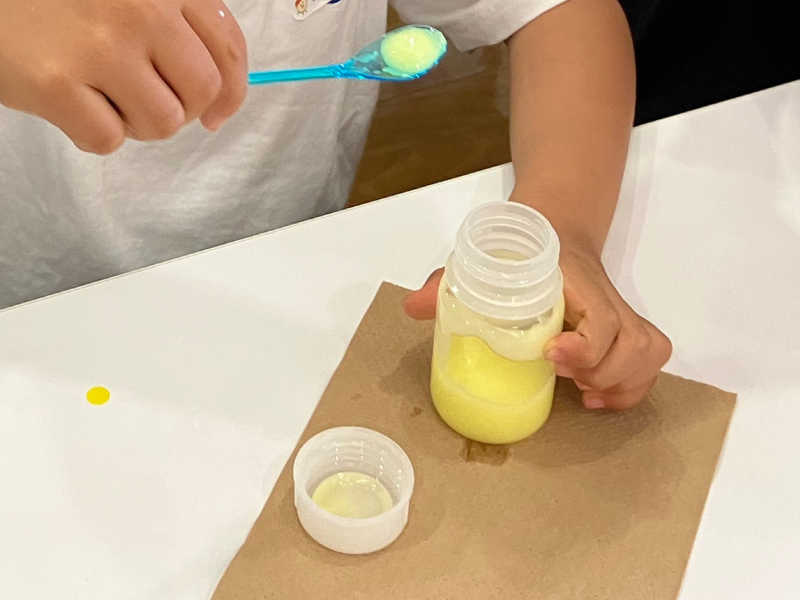 子どもたちも自分でそれぞれの材料を混ぜ、水と油がクリームに変わっていく様子を目の当たりにして大盛りあがりだった。