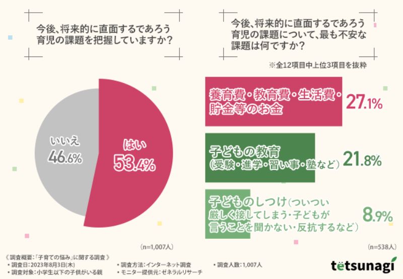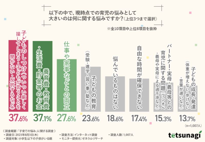 匿名子育て掲示板『てつなぎ』を運営している株式会社コミットグロースは、小学生以下の子どもがいる親を対象に、「子育ての悩み」に関する調査を実施した。