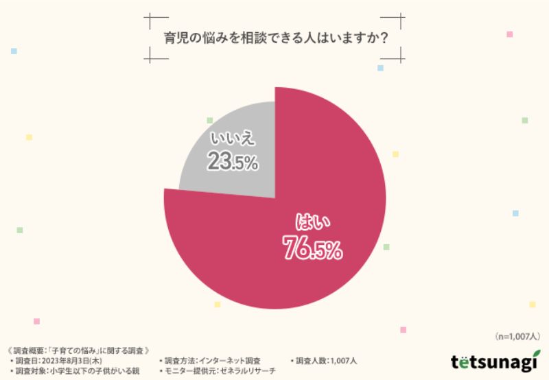 ここで、「育児の悩みを相談できる人はいるか」を質問している。約8割が「いる(76,5%)」と回答。残る2割が「いいえ(23,5%)」ということは、約4人に1人は悩みを相談できる相手がいないという現状だ。