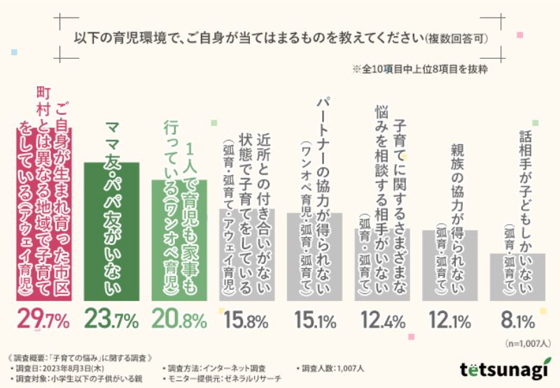 続いて「ママ友・パパ友がいない(23.7%)」「1人で育児も家事も行っている(ワンオペ育児)(20.8%)」「近所との付き合いがない状態で子育てをしている(孤育・孤育て・アウェイ育児)(15.8%)」「パートナーの協力が得られない(ワンオペ育児・孤育・孤育て)(15.1%)」「子育てに関するさまざまな悩みを相談する相手がいない(孤育・孤育て)(12.4%)」と並んだ。