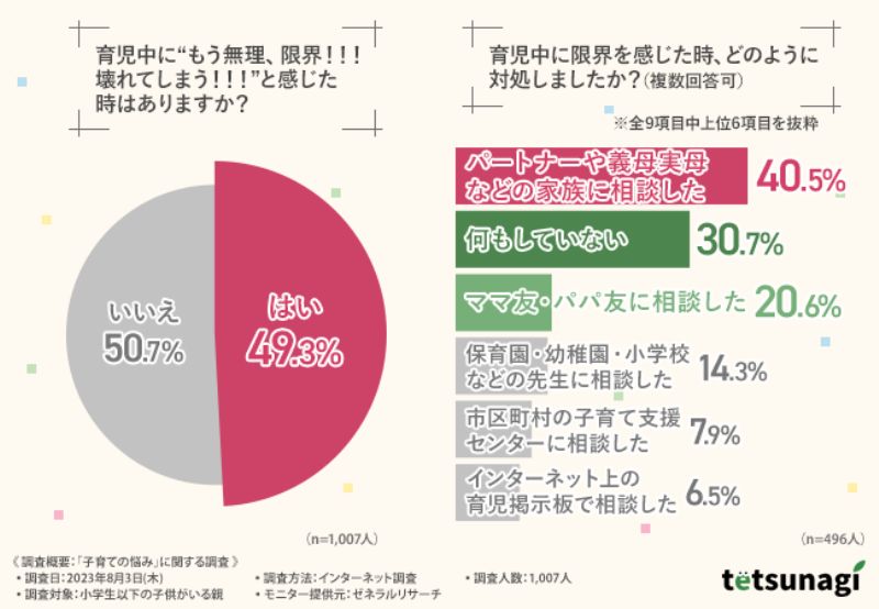 そう感じたときはどのように対処しているのだろう。「育児中に限界を感じたとき、どのように対処しましたか?(複数回答可)」と聞くと、最も多かったのは「パートナーや義母実母などの家族に相談した(40.5%)」だった。