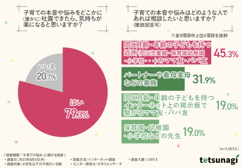 「子育ての本音や悩みをどこかに(誰かに)吐露できたら、気持ちが楽になると思いますか?」と尋ねると、約8割が「はい(79.3%)」と答えた。話を聞いてもらうだけでも心は軽くなるものだ。