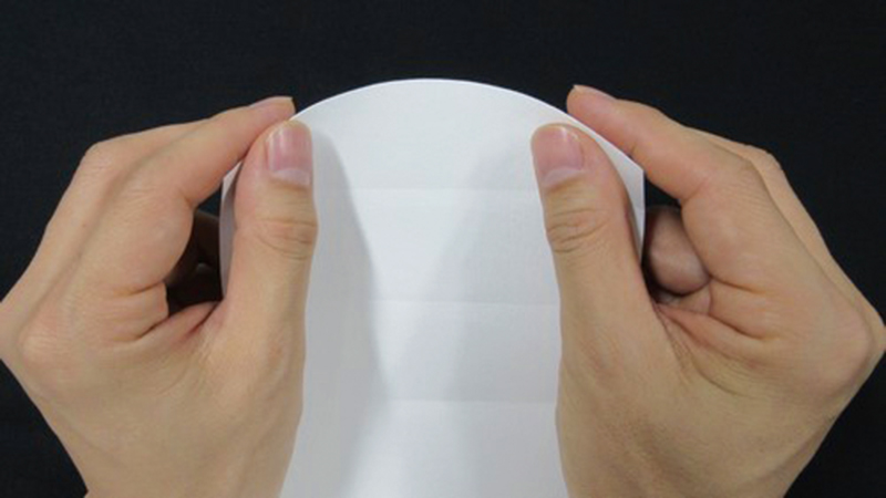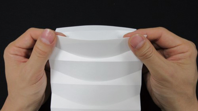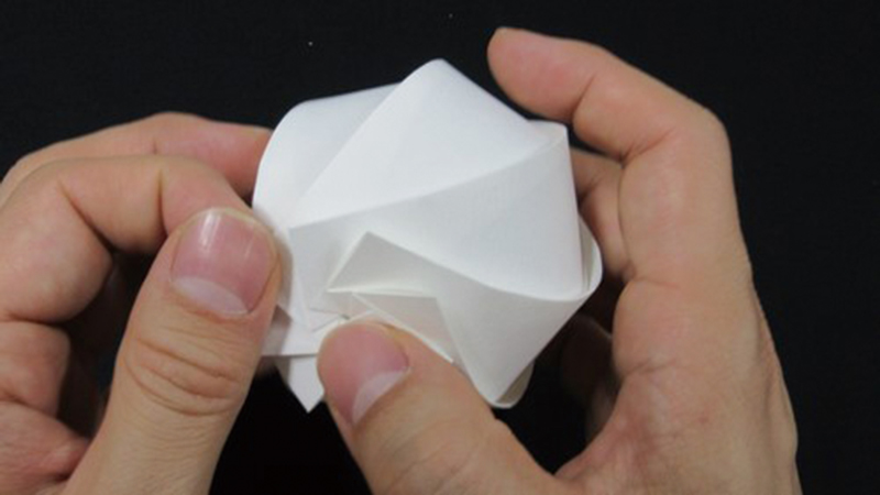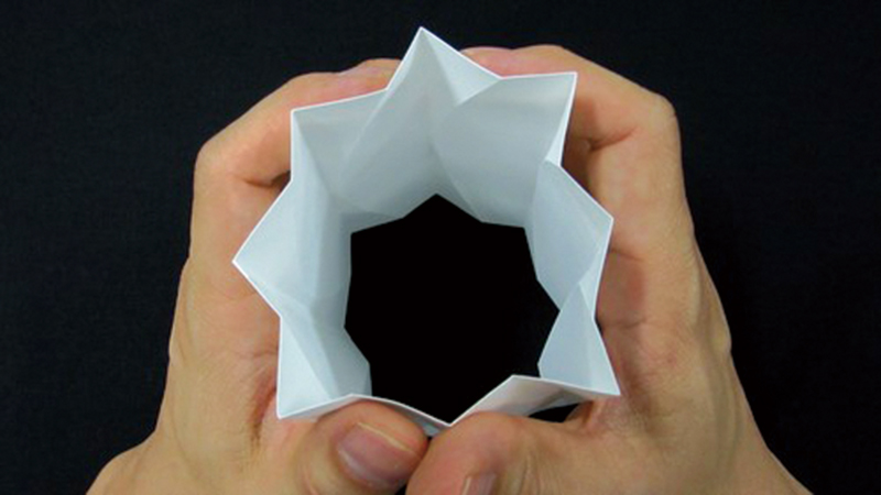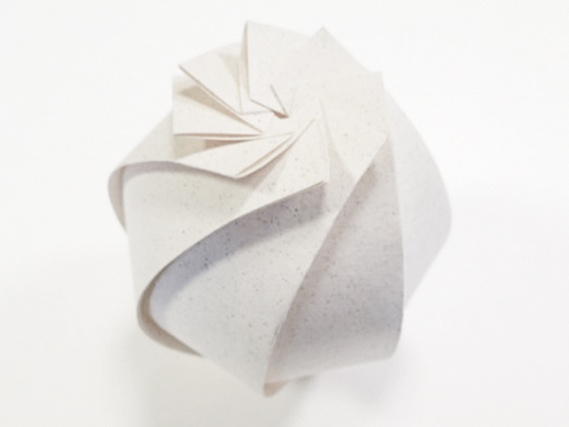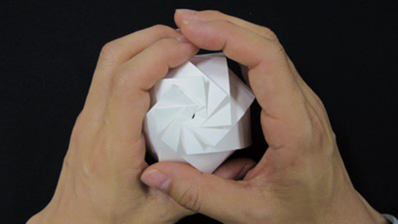 最もシンプルな立体ともいえる球体を中に包むようにした立体折り紙。筒状にするために紙の端を貼り合わせる必要があるが、上下のしぼりの構造で形が安定する。曲線での折りは紙を宙に浮かせ、全体を丸めるようにして折ろう。