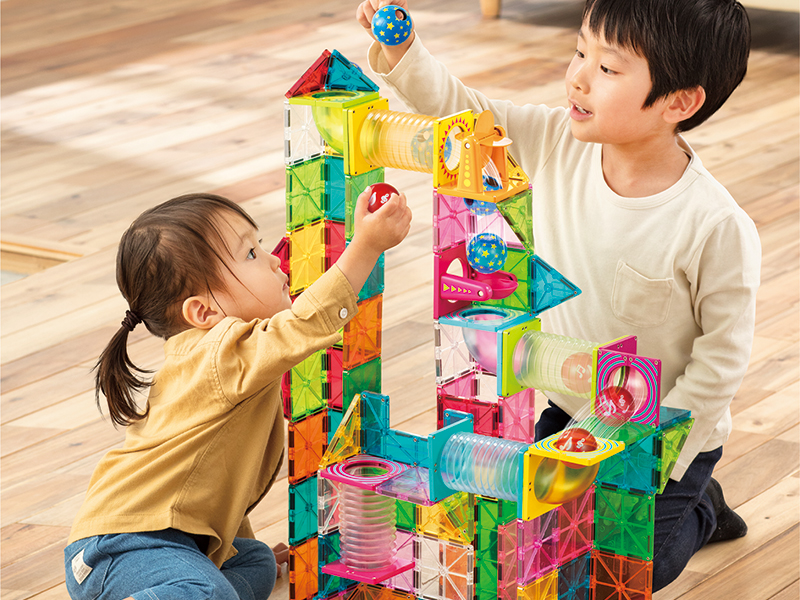 数学の教材から誕生した、磁石でピタッとくっつくロングセラー玩具。平面から立体を作り上げて遊ぶことで、創造力はもちろん空間認識や算数を理解する力も育つ。1歳からのBASIC、3歳からのWORLD、小学生のSCHOOLと多彩なシリーズがあるのも魅力。
