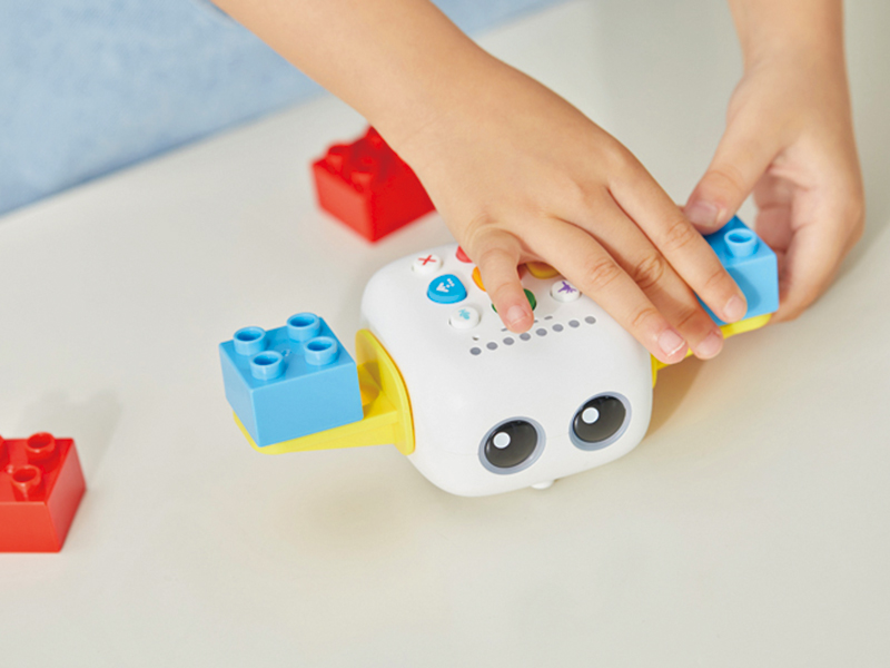 幼児から楽しくプログラミングを体験できる知育玩具。タブレットやパソコンは不要! ロボットがおしゃべりをしながら遊び方をガイドしてくれて、頭の上のボタンを押すだけでプログラミングができるので簡単。言葉、数字、音楽、図形、色などを遊びながら学べる。