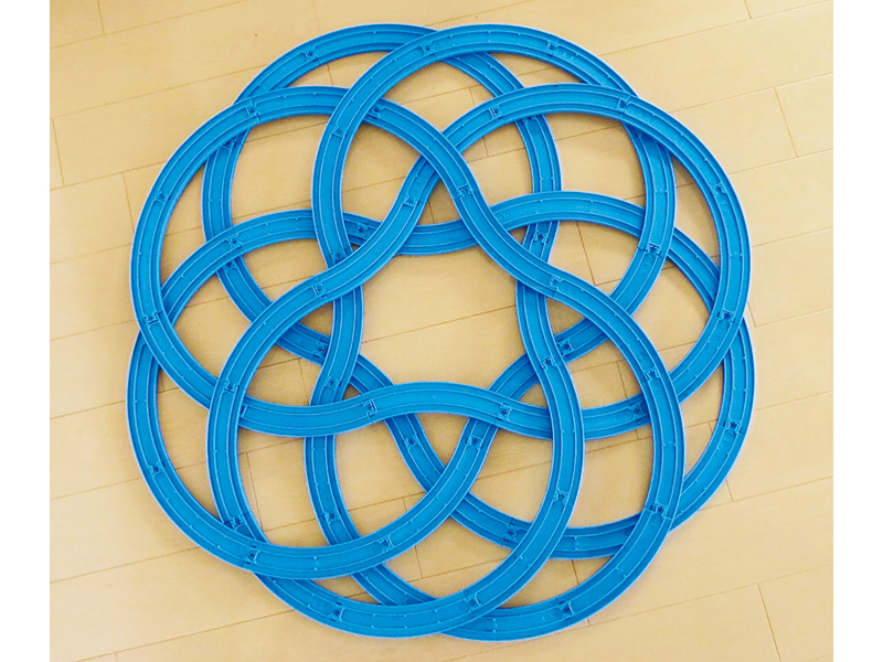 「子どもとプラレールで遊ぶうち、『曲がる』『まっすぐ』の2種類のレールで何ができるか挑戦したくなりました」と三谷先生。プラレールのコースを設計するソフトウェアを自作し、幾何学的な図形に挑戦。レールは電車が走るものという前提を覆した遊び心あふれるアイデアが、ネット上でも話題に。