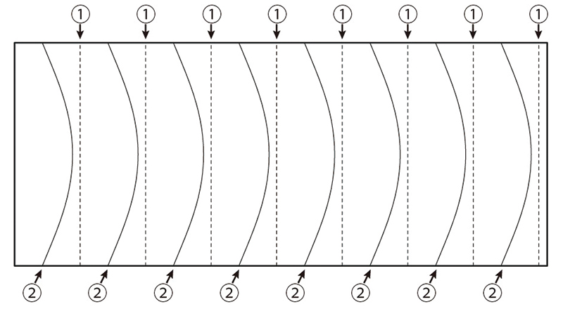 2 展開図内の②の線(8本)をすべて①と反対側に折る。紙を丸めて立体的になるように折る。
