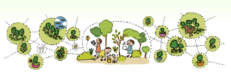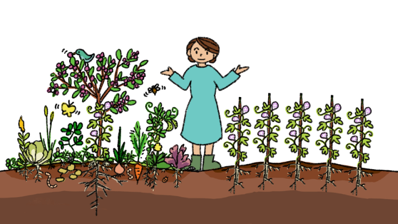 自然の森や林では、ひとつの植物だけが成長するということはない。さまざまな植物が育ち、枯れ、枯れたものは「肥料分」となったり、「空洞」をつくったりする。また、そこに鳥や虫や他の生物が集まって、葉っぱや実を食べ、代わりに花粉や種を運んだり、そのふんが養分になったりする。
