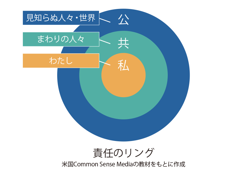 そこで伝えておきたいのが、「責任のリング」という概念だ。「責任のリング」は三重の円でできていて、一番中心の円は「私」。その周りが「共」、いわゆる周囲の人々。その外に「公」、つまり公共の社会、あるいは自分の知らない世界が広がっている。自分がオンラインのやりとりをする際に、メッセージはどこに届いているのか、誰に対して責任を果たさなければいけないのか、考えるためには有効なアイデアだ。