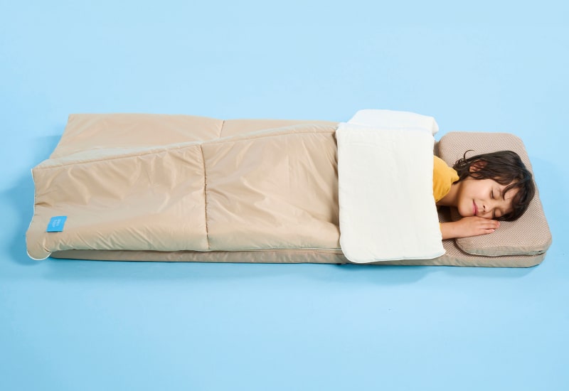 マットレス+枕+布団が1つになった寝具。体温が高くなりがちな子どもに、枕・マットレスの超通気性素材が睡眠中の熱や汗を放出して寝床内温度をコントロール。すべて洗うことができるので、寝汗やおねしょをしても対処が簡単。コンパクトなのでキャンプにもそのまま持っていける。