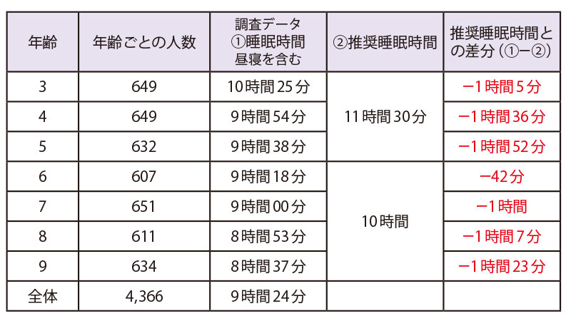 保護者の共働き、習い事、テレビやゲームなど現代の子どもを取り巻く生活環境は夜型化し、睡眠時間は昔に比べ減少していると言われている。