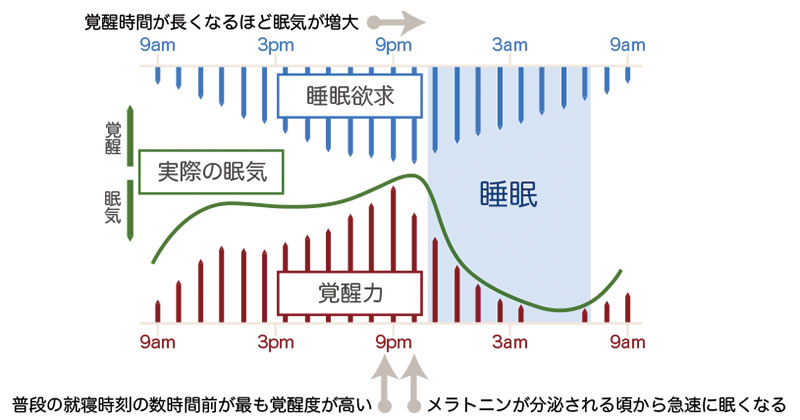 起きている時間に応じて脳内に蓄積する「睡眠圧(睡眠欲求)」と、夜になると自然と眠気をもたらす「体内時計」、主にこの2つの連動により動物は眠る。