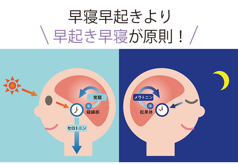 ズレを直すためには、朝太陽の光を浴びること。そこで体内時計がリセットされて、夜の眠気を引き出してくれるのだ。