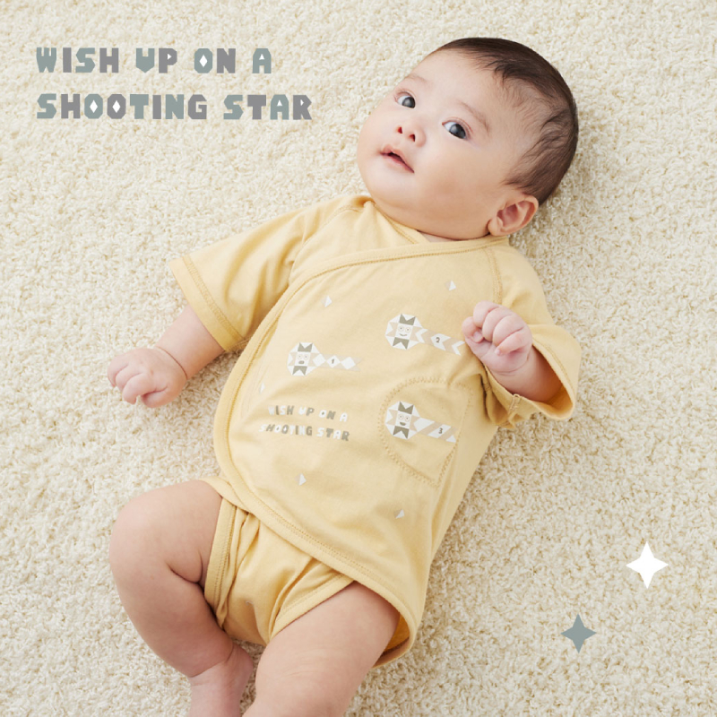 子どもが生まれると「元気に育ちますように」「幸せになりますように」など、親はたくさんの願いごとをする。流れ星に3回願いごとをすると叶う、と言われていることにかけて、3ステップで簡単に着せられる新生児肌着『PATTO SATTO HADAGI』は、3つの流れ星をあしらったデザインに。