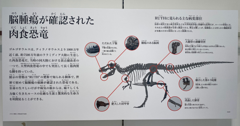 大型肉食恐竜には肋骨の変形や足の疲労骨折などの症例はよく見られるものの、「ルース」の骨格にはそれ以上の病変部が全身に確認できる。脳腫瘍による何らかの機能障害が多数のけがの原因となり、真っすぐに歩くことさえ困難な状態で何年も生き延びたのではと推測されており、現在も研究が進められているそうだ。