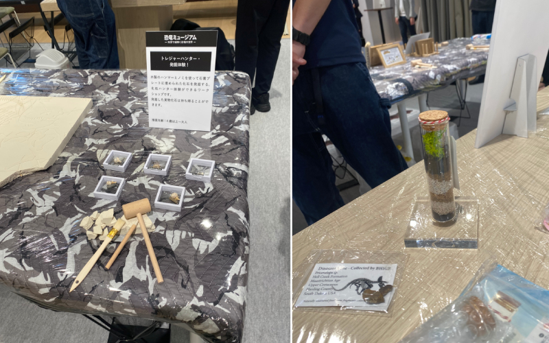 開催期間中には、木製のハンマーとノミを使って石膏プレートに埋められた化石を発掘する化石ハンター体験や、恐竜の実物化石を封入して地層を模すガラスボトル作りなど、より恐竜に関わる世界を楽しんで親しめる体験も催された。