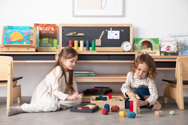 家庭の状況に合わせて組み合わせられるモジュール型の上質なデスクやシェルフ、チェストなどは、国際モンテッソーリ教師資格を持った清水美香氏の監修により、モンテッソーリ教育のメソッドを家庭でも取り入れられる特別な設計が施されている。