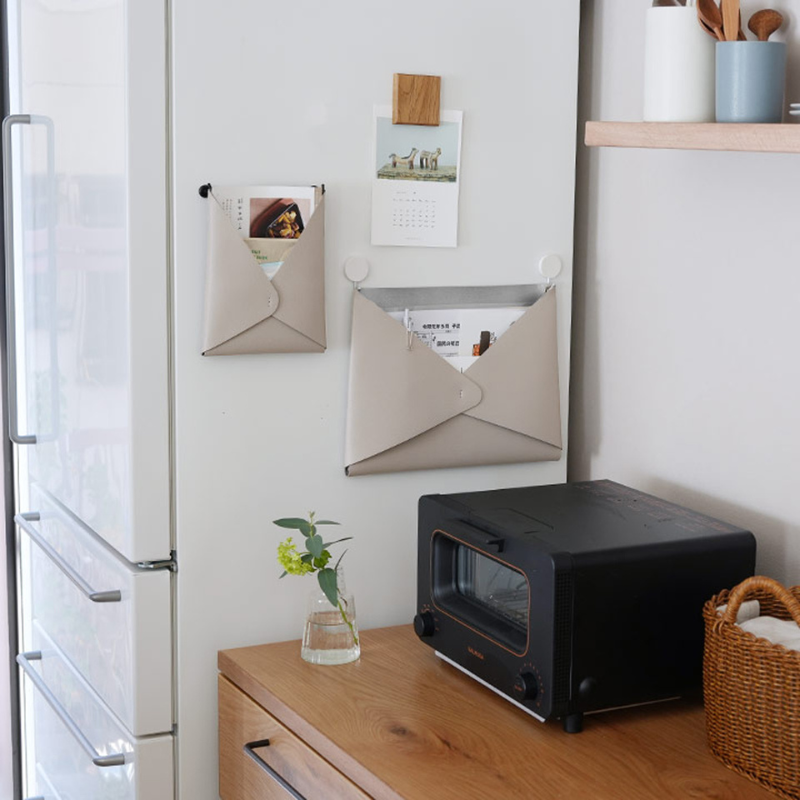 マグネットフックや画鋲を使って、冷蔵庫の横や玄関ドアの裏など、省スペースで設置できる。