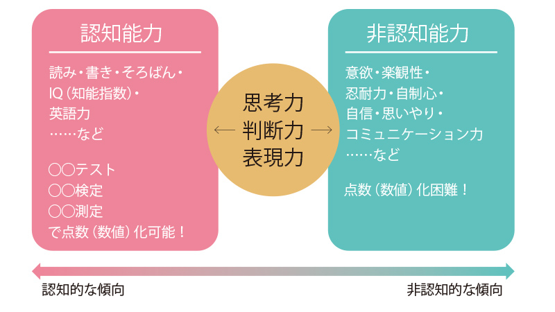 読み・書き・そろばんといわれるようなものからIQ(知能指数)、英語力などは数値化できるため「認知能力」。意欲・楽観性や忍耐力・自制心、さらには思いやりやコミュニケーション力は数値化できないため「非認知能力」となる。
