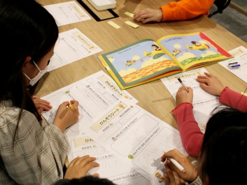 保護者同士が話し合っている間は、子ども向けワークショップも同時開催。子ども向けワークショップでは、子どもたちが絵本を読んで、その感想を紙に書くという取り組みをした。