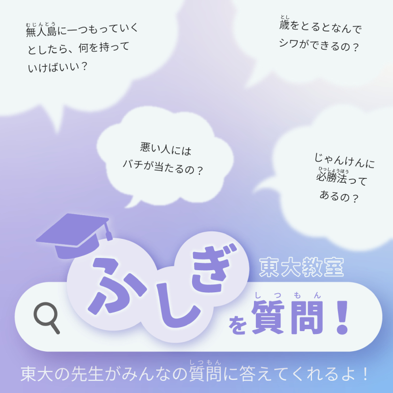 さらに、小学生の日常の「なぜ」を東大の先生が考えて答えるという講演も! 「歳をとるとなんでシワができるの?」「じゃんけんに必勝法ってあるの?」など、不思議に思っていることをなんでも聞いてみよう。