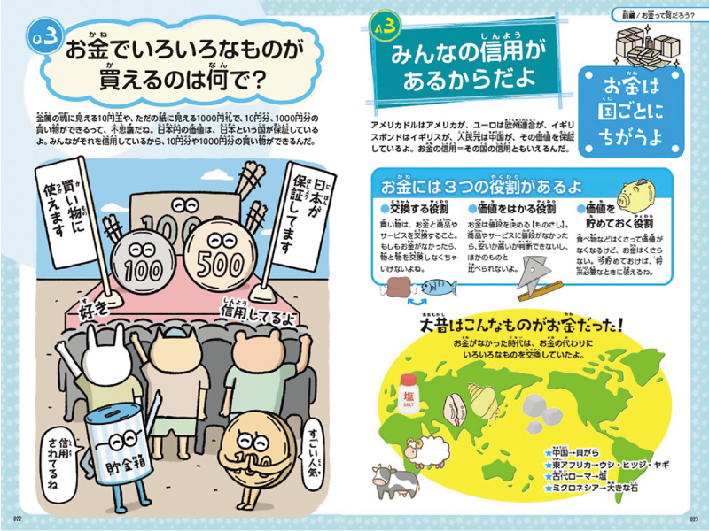お金の歴史や知識、お金の役割なども楽しく紹介。