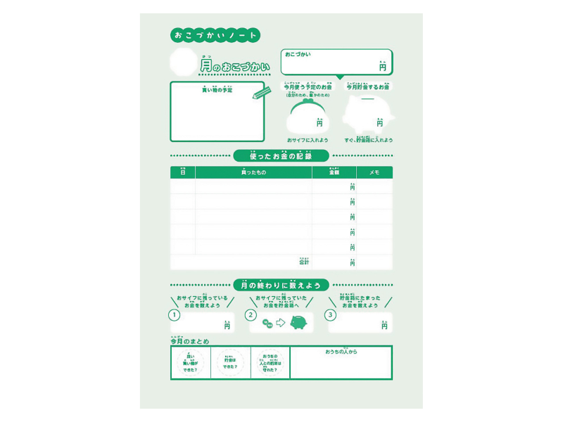 細かい計算が苦手な小学生でも、無理なく続けやすいお小遣い帳。