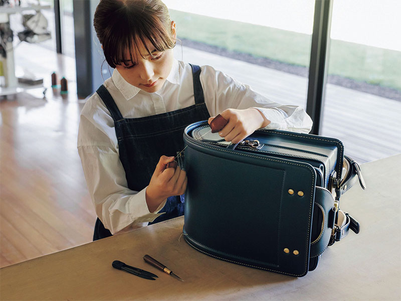 鮮やかな内装が美しいランドセル、「アトリエ」シリーズ。2025年入学用では、「ミナ ペルホネン」描き下ろし絵柄3種×各2色を展開。メイン素材に人工皮革を採用し、前年より約70g軽量に。6年間無料修理保証に加え、卒業後修理サービス(有料)も導入。