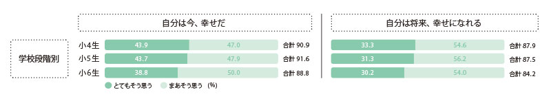 「自分は今、幸せだ」「自分は将来、幸せになれる」の2項目について、「とてもそう思う」「まあそう思う」「あまりそう思わない」「まったくそう思わない」の5段階で回答させた調査の結果。小学生は「そう思う」「まあそう思う」が9割だった。