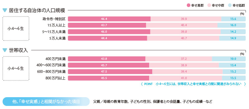 特に小学生のうちは、住んでいる自治体の人口規模や世帯年収は、子どもの幸せ実感に相関があるわけではないようだ。