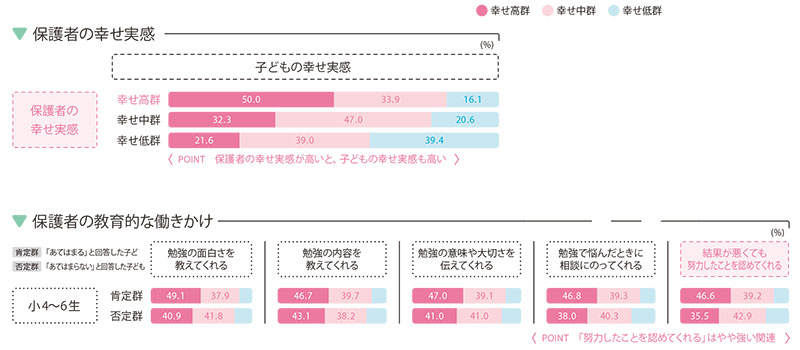 保護者の教育的な関わり方として、特に「結果が悪くても努力したことを認めてくれる」といった寄り添うような働きかけを受けている子どもは幸せ実感が高かった。