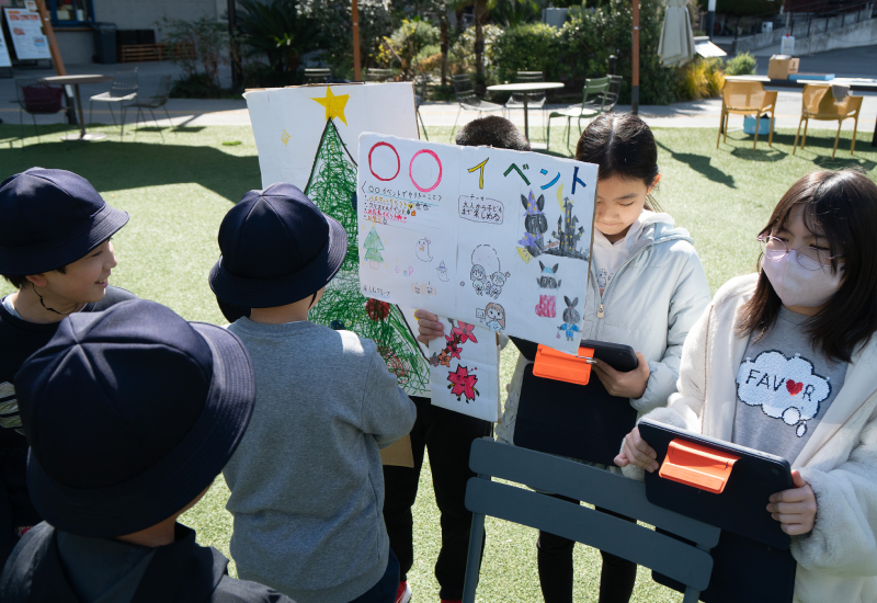 これは、令和4年4月に開校したばかりの新しい小学校、港区立芝浜小学校の4年生の取り組み。総合的な学習の時間の一環で自分たちの住む地域について学んできた集大成として、Hi-NODEや芝浦の街を舞台としたまちづくりのアイデアを、保護者や地域の方にプレゼンテーションをするというものだ。
