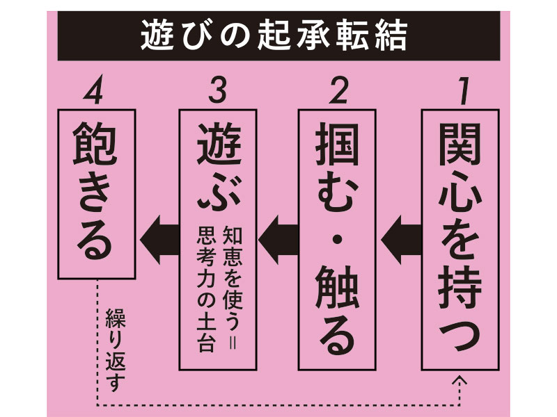また「同じ遊びばかりしている子」は、興味をもった遊びに納得するまでじっくり「③遊ぶ」ので、起承転結のサイクルがゆっくりになる、という見方もできます。