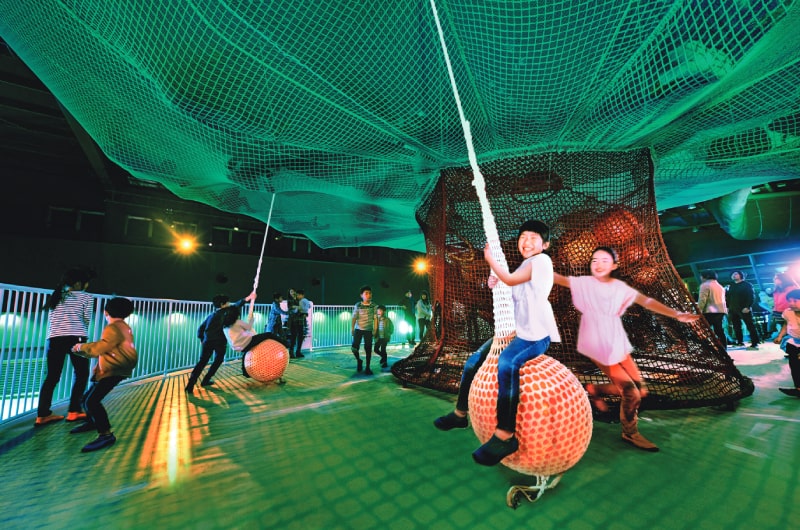 注目は、昼夜・四季の移り変わりなど、里山の森の1年を光と音で表現した屋内型のアスレチック『巨大ネットの森 SUMIKA』。天候や暑さを気にせずに思い切り身体を動かすことができるのが嬉しい。