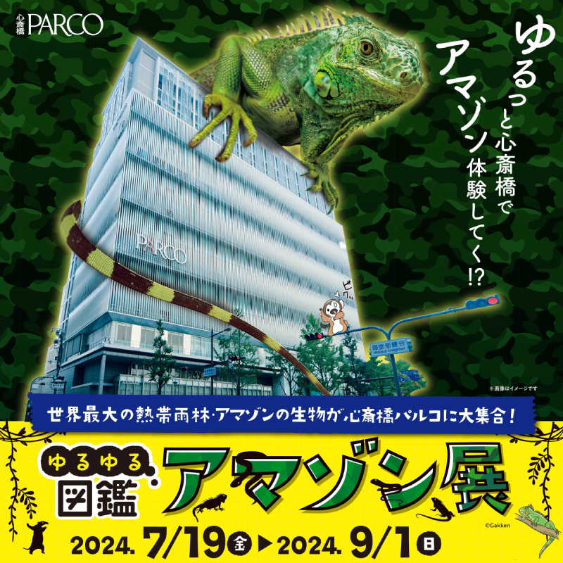 大阪・心斎橋駅すぐの心斎橋PARCOでは、7月19日(金)から9月1日(日)の45日間、株式会社Gakkenが発行する『ゆるゆるアマゾン図鑑』の世界観をもとにした生体展「ゆるゆる図鑑アマゾン展」が開催される。