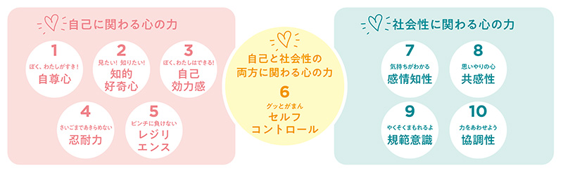 絵本・児童書を出版するポプラ社と共同で研究を行う東大CEDEPは、非認知能力の分類例として次のような10のカテゴリを提案している。わが子に伸ばしてほしい力について考えたり、絵本・児童書を選ぶ際の参考にしてみよう。