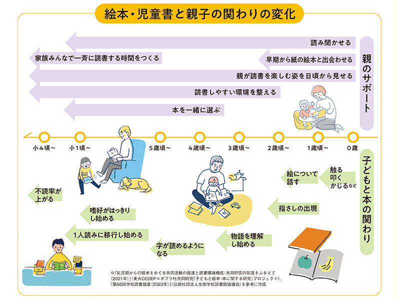 赤ちゃんの時期から絵本を身近に置き、幼児期には読み聞かせをたくさんして親子で楽しさを共有し、次第に自分で読んでみたい気持ちを育むといったように、発達に応じた楽しみ方を親がサポートしていきましょう」。
